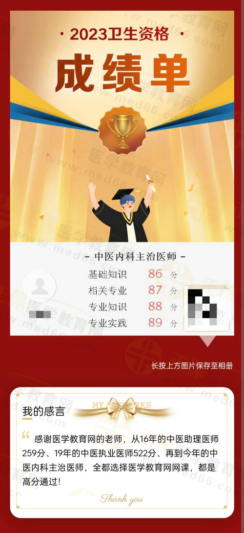 感謝醫(yī)學(xué)教育網(wǎng)的老師,從16年的中醫(yī)助理醫(yī)師259分、19年的中醫(yī)執(zhí)業(yè)醫(yī)師522分、再到今年的中醫(yī)內(nèi)科主治醫(yī)師,全都選擇醫(yī)學(xué)教育網(wǎng)網(wǎng)課,都是高分通過!