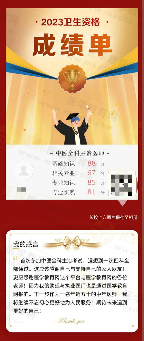 首次參加中醫(yī)全科主治考試,沒(méi)想到一次四科全部通過(guò)。這應(yīng)該感謝自己與支持自己的家人朋友!更應(yīng)感謝醫(yī)學(xué)教育網(wǎng)這個(gè)平臺(tái)與醫(yī)學(xué)教育網(wǎng)的各位老師!因?yàn)槲业闹砼c執(zhí)業(yè)醫(yī)師也是通過(guò)醫(yī)學(xué)教育網(wǎng)報(bào)的。下一步作為一名年近五十的中年醫(yī)師,我將繼續(xù)不忘初心更好地為人民服務(wù)!期待未來(lái)遇到更好的自己!