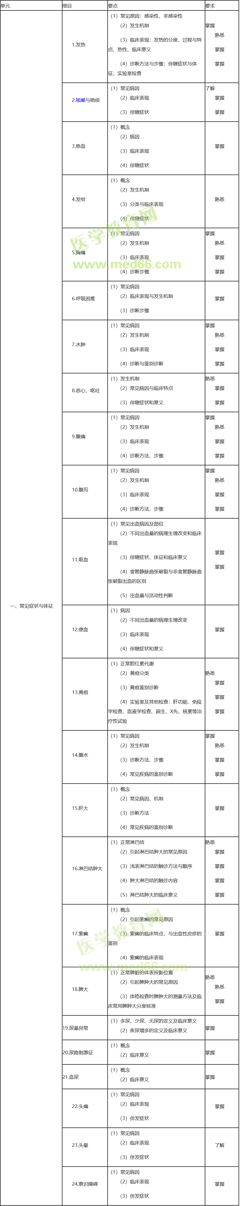 根據(jù)內(nèi)科中級(jí)職稱(chēng)考試大綱所說(shuō),關(guān)于常見(jiàn)癥狀與體征考核的主要是下面這些情況,具體要點(diǎn)和哪些是必須掌握的都在下表中,可以仔細(xì)查看。