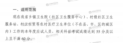 為進一步加強浙江省農村衛(wèi)生技術人員隊伍建設,結合浙江省實際,確定2020年度中級衛(wèi)生專業(yè)技術資格考試各專業(yè)、各科目省定合格標準為55分。