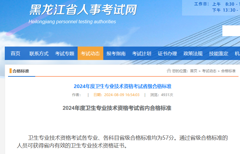 黑龍江省2024年度衛(wèi)生專業(yè)技術資格考試省級合格標準公布!