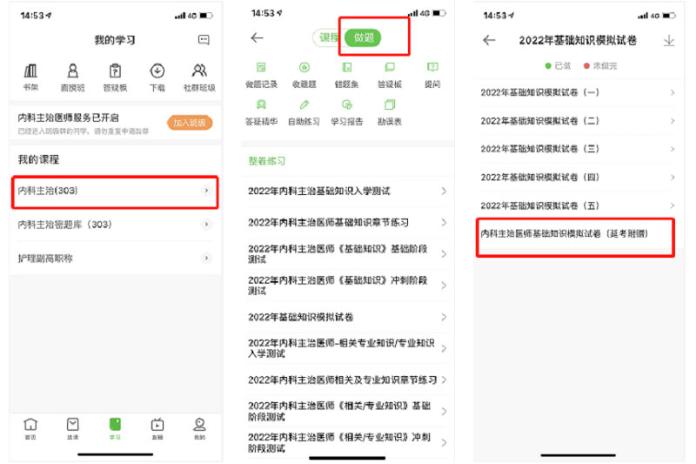 (2)選擇上方“做題”,找到相應(yīng)考試科目延考附贈(zèng)模擬試卷,如“內(nèi)科主治醫(yī)師基礎(chǔ)知識(shí)模擬試卷”。