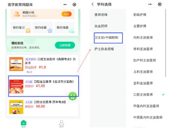 2、點(diǎn)擊“切換”-“衛(wèi)生初/中級(jí)職稱”,選擇報(bào)考類別,進(jìn)入類別頁(yè)面下滑到底部選擇“應(yīng)試奪分寶典”,3人團(tuán),到手價(jià)僅需1元!