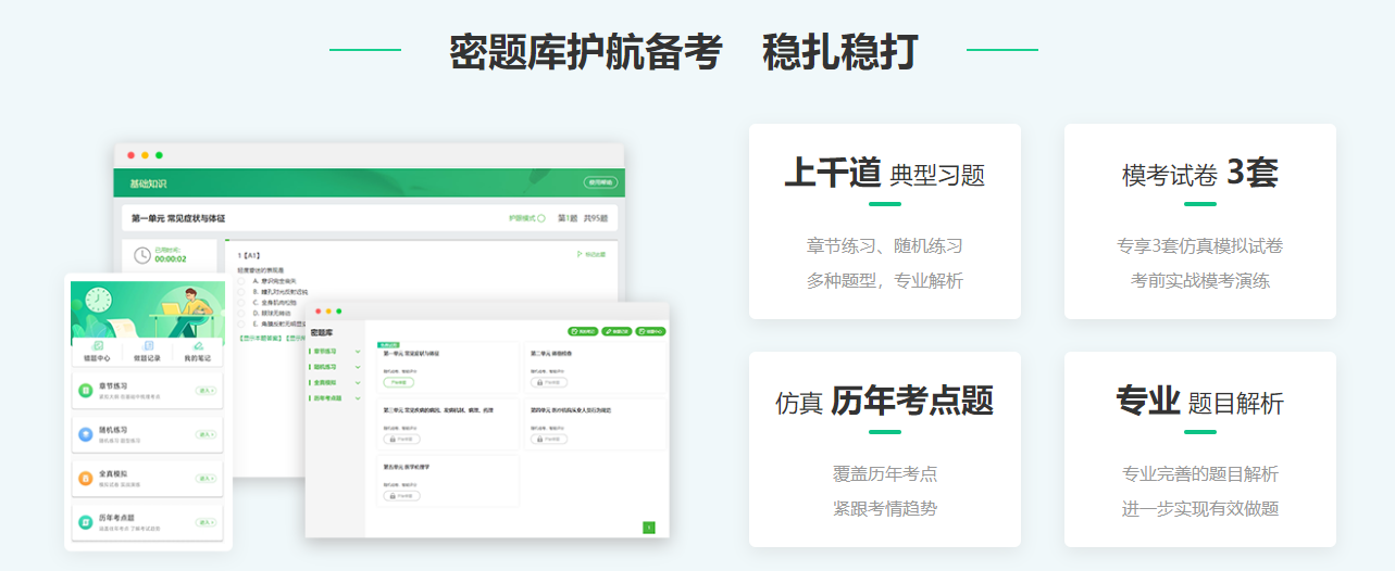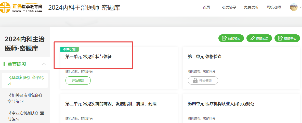 特別提示:【章節(jié)練習(xí)】-【基礎(chǔ)知識章節(jié)練習(xí)】-【第一單元常見癥狀與體征】已開通免費(fèi)試用供大家體驗(yàn)。(購買《密題庫》即可解鎖精彩的隨機(jī)練習(xí)及歷年考點(diǎn)題模塊。)