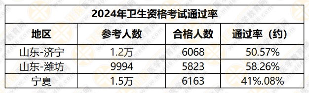據(jù)醫(yī)學(xué)教育網(wǎng)統(tǒng)計,山東濟寧、山東濰坊、寧夏3地的衛(wèi)生資格考試通過率均不足60%,同時,2019至2023年間,山東臨沂和日照的衛(wèi)生資格考試通過率也未達到60%。
