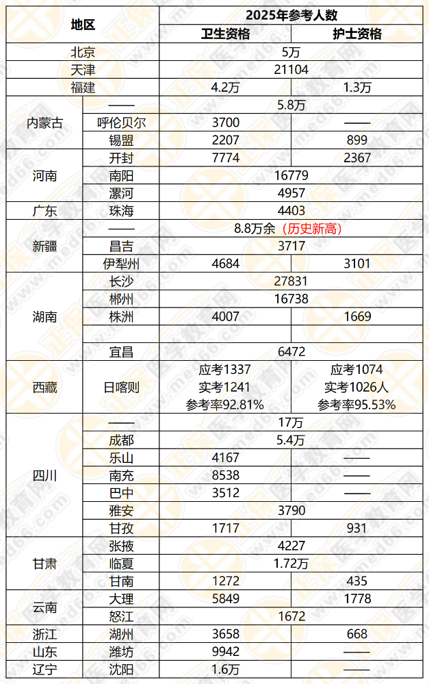 2025年的衛(wèi)生資格考試參考人數(shù)持續(xù)增加,與2024年相比,大部分地區(qū)的報考人數(shù)基本持平或略有上升,但個別地區(qū)如新疆,其考生人數(shù)從7萬人激增至8.8萬人,創(chuàng)下歷史新高。