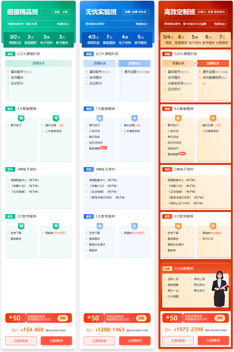 * 高效定制班、無憂實(shí)驗(yàn)班、超值精品班享受8.5折優(yōu)惠,折上領(lǐng)券再減!