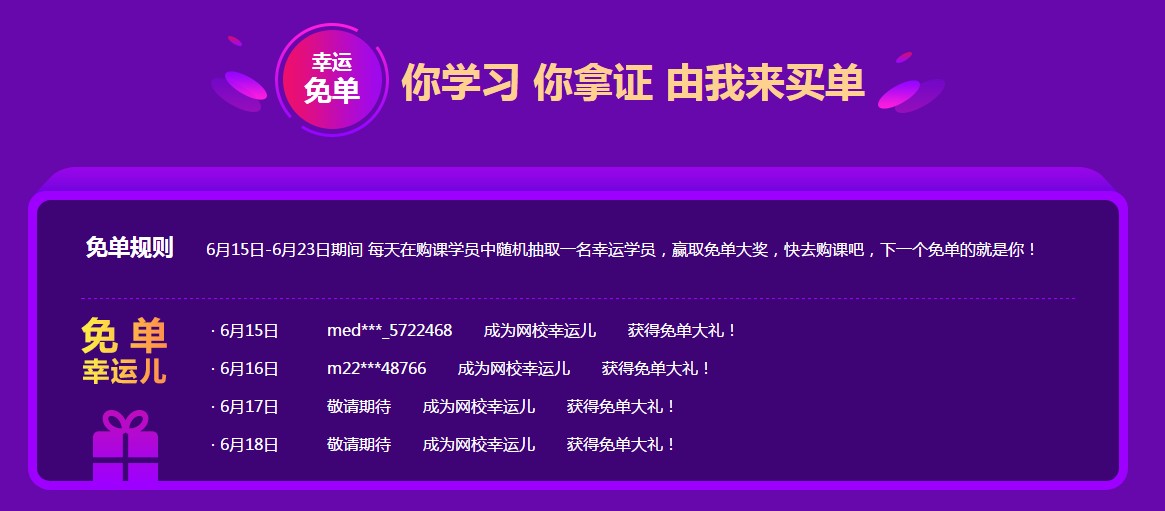活動規(guī)則:6月15日-6月23日期間 每天在購課學員中隨機抽取一名幸運學員,贏取免單大獎,快去購課吧,下一個免單的就是你!