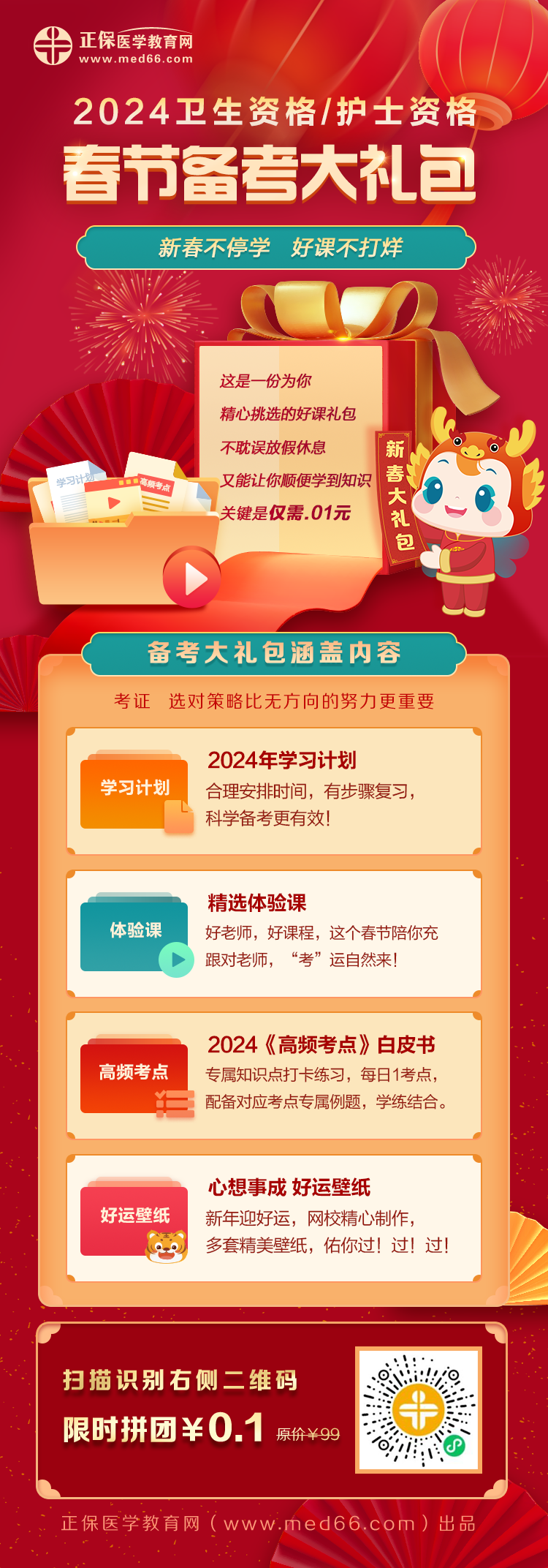 龍年的第一個(gè)目標(biāo):通過2024年衛(wèi)生資格/護(hù)士資格考試!醫(yī)學(xué)教育網(wǎng)為廣大2024年衛(wèi)生資格/護(hù)士資格考生準(zhǔn)備了《新春大禮包》!原價(jià)99元,3人拼團(tuán),限時(shí)0.1元!希望各位考生過年休息的同時(shí)別忘了每天進(jìn)步一點(diǎn)點(diǎn),在龍年拿下證書!