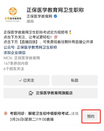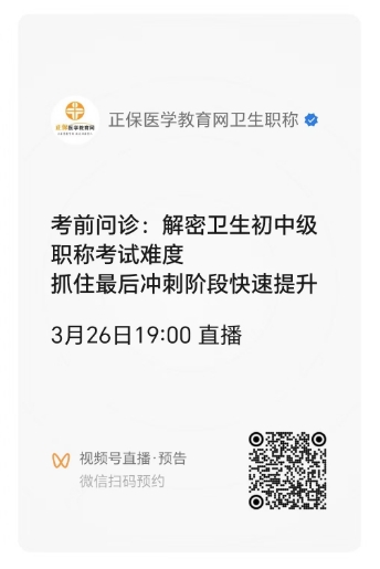 關(guān)注微信視頻號"正保醫(yī)學教育網(wǎng)衛(wèi)生職稱"(關(guān)注后中獎概率會更高哦?。?/span>,可以掃碼直接預約直播。直播當天會收到開播提醒,在直播間直接申請連麥與老師暢談。