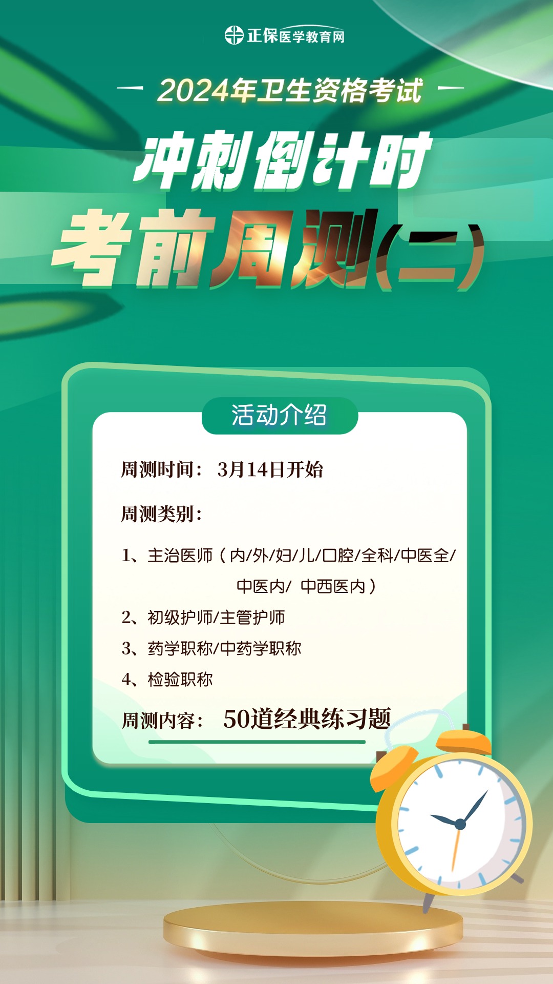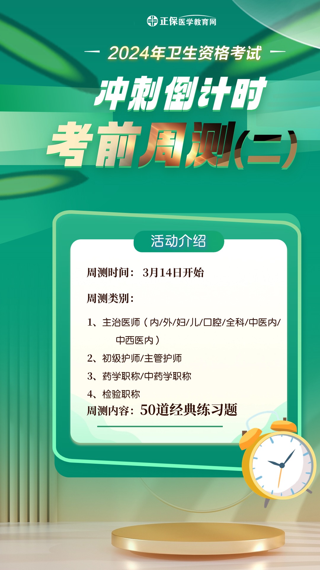 2024年衛(wèi)生資格考試已經(jīng)進入全面沖刺階段,只剩下不到一個月的備考時間,抓緊時間刷題備考才能在最后的考試中“脫穎而出”!考前周測,等你來參與!