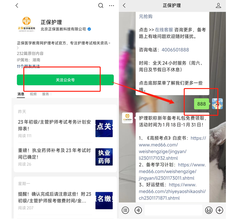 步驟一:掃描上方海報(bào)上的二維碼,關(guān)注“正保醫(yī)學(xué)教育網(wǎng)衛(wèi)生職稱”微信公眾號(hào)。已關(guān)注用戶直接回復(fù)關(guān)鍵詞:888;