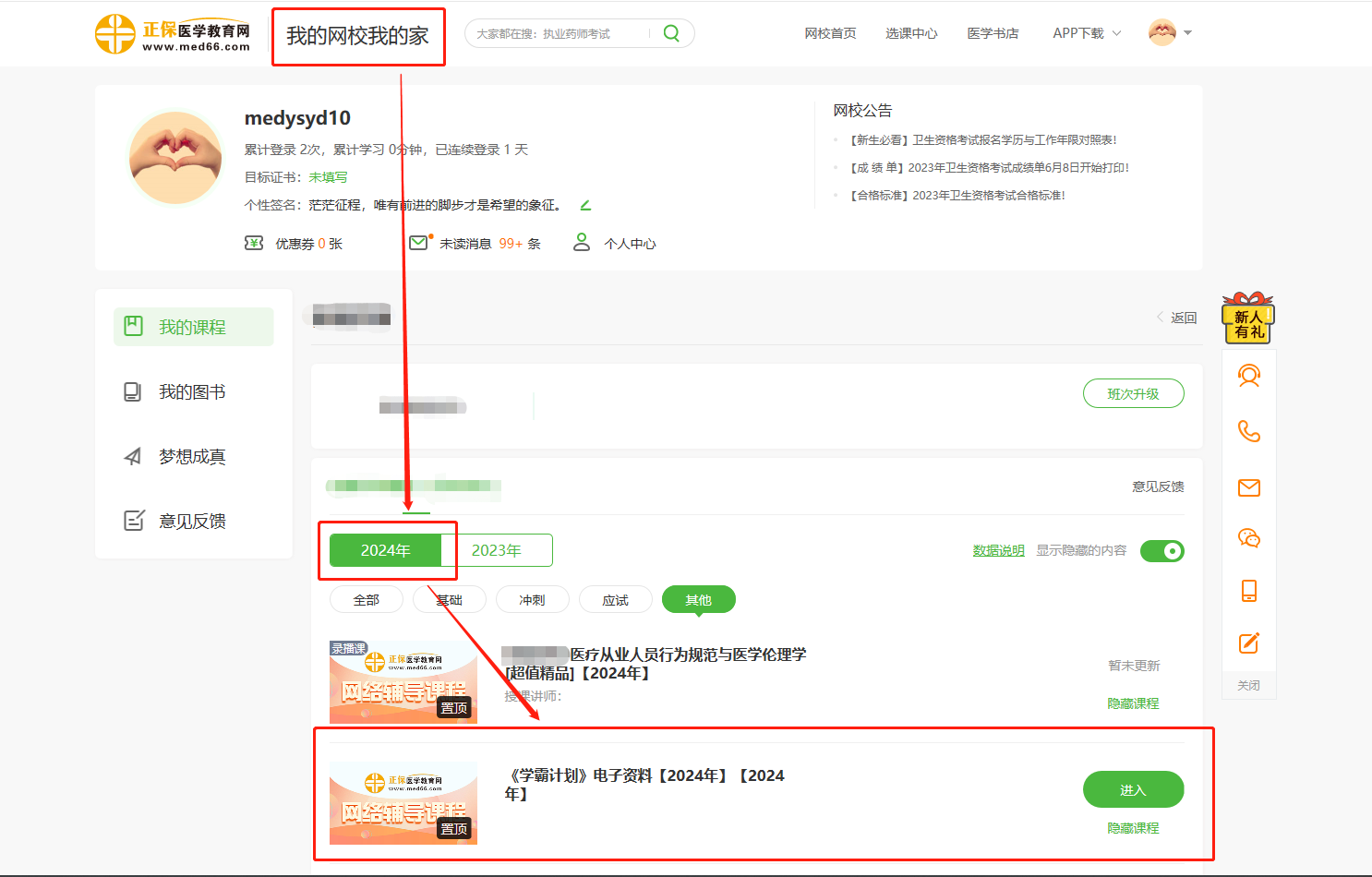 2024衛(wèi)生資格/護(hù)士輔導(dǎo)配套資料《學(xué)霸計(jì)劃》電子資料已上線,已購買2024年衛(wèi)生/護(hù)士資格超值精品班/無憂實(shí)驗(yàn)班/高效定制班的學(xué)員可在[我的網(wǎng)校我的家]進(jìn)行查看/下載,醫(yī)學(xué)教育網(wǎng)為您整理詳細(xì)查看/下載流程!