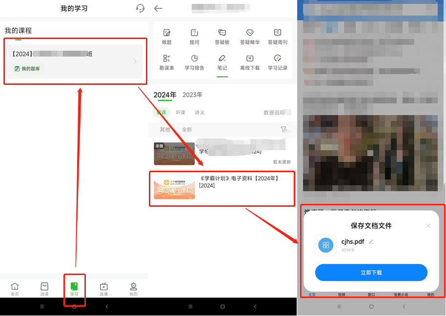 登錄【醫(yī)學(xué)教育網(wǎng)APP】-學(xué)習(xí)-選擇已購課程-點(diǎn)擊《學(xué)霸計(jì)劃》電子資料-保存文檔文件