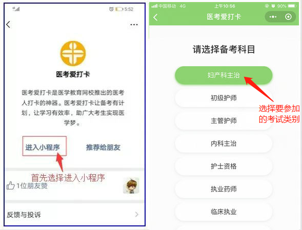 第二步:掃描之后會進入如下截圖頁面,請點擊“進入小程序”按鈕,然后“選擇您的備考科目”,如婦產(chǎn)科主治;