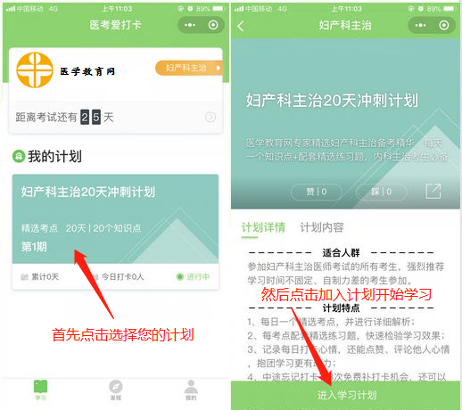 第三步:選擇備考科目后即進入學(xué)習(xí)計劃選擇的頁面,請選擇“您的備考計劃”,如婦產(chǎn)科主治20天沖刺計劃,然后點擊下方“加入計劃開始學(xué)習(xí)”按鈕,開始正式進入打卡學(xué)習(xí)。