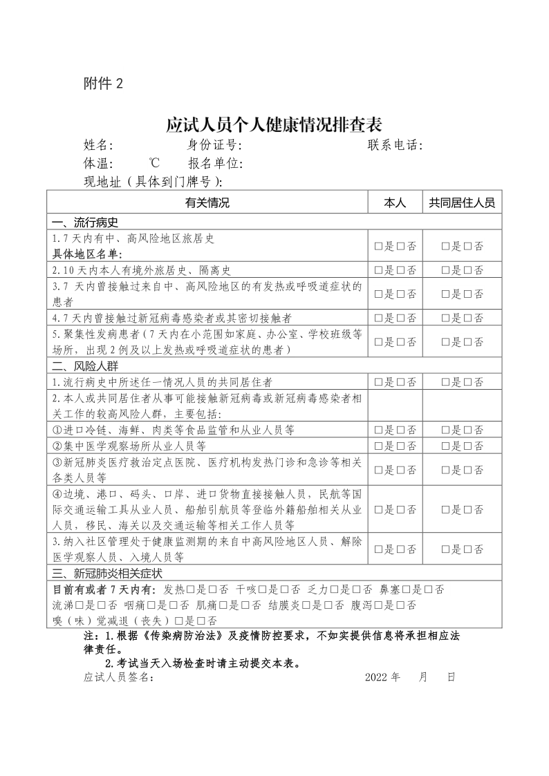 3.備考期間,做好個(gè)人自主健康監(jiān)測,填寫完整的《應(yīng)試人員個(gè)人健康情況排查表》(附件2),考試當(dāng)天入場檢查時(shí)請主動交給考試工作人員。