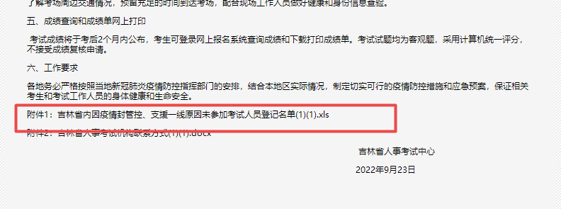 附件1:《吉林省內(nèi)因疫情封管控、支援一線原因未參加考試人員登記名單》考生可登錄吉林人事考試網(wǎng)《關(guān)于另行組織2022年度衛(wèi)生專業(yè)技術(shù)資格考試考務(wù)工作安排的通知》公告中進(jìn)行查看。如圖位置所示: