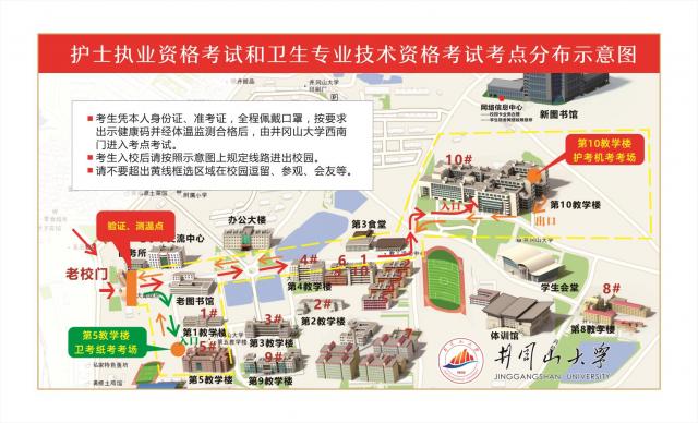 2021年衛(wèi)生專業(yè)技術(shù)資格考試將于4月10、11、17、18日在井岡山大學(xué)舉行(詳情見準(zhǔn)考證),屆時(shí)考生憑身份證、準(zhǔn)考證(兩證缺一不可),佩戴口罩,按要求出示健康碼并經(jīng)體溫檢測合格后,從老校門步行(車輛無法入內(nèi))進(jìn)入學(xué)校參加考試。等候時(shí),要求每位人員保持間隔為 1 米以上的安全距離。