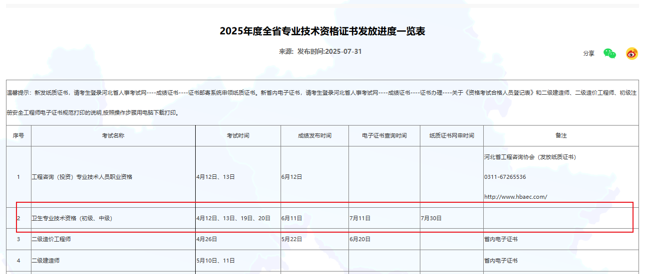 河北2025年衛(wèi)生資格考試證書7月30日開始申請郵寄!