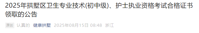 杭州拱墅區(qū)2025年衛(wèi)生專業(yè)技術(shù)(初中級)考試合格證書領(lǐng)取公告