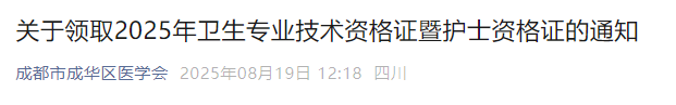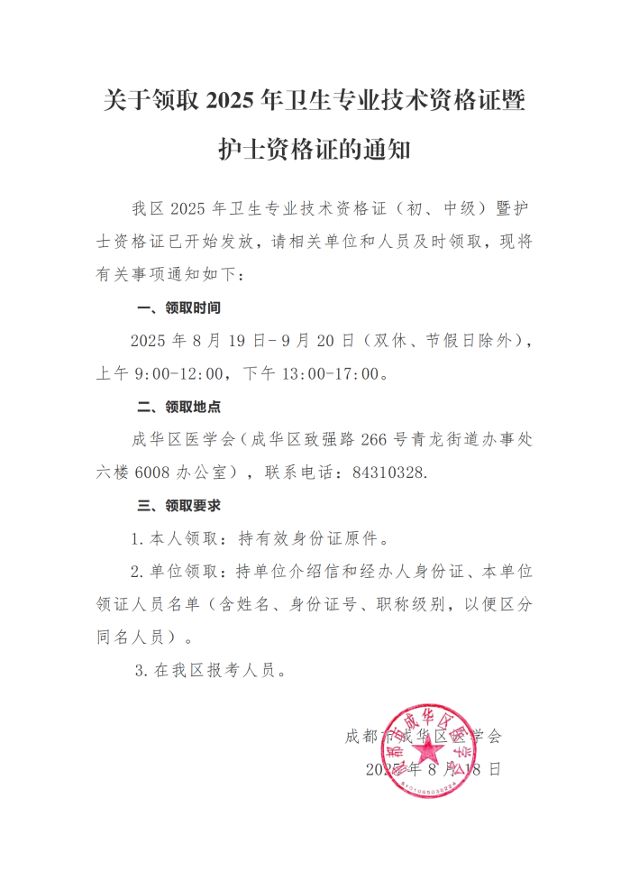 成都成華區(qū)關(guān)于領(lǐng)取2025年衛(wèi)生專業(yè)技術(shù)資格證的通知