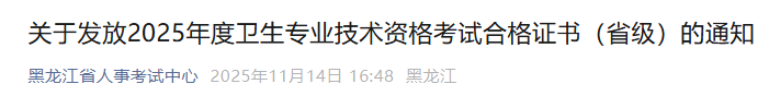 黑龍江關(guān)于發(fā)放2025年度衛(wèi)生專業(yè)技術(shù)資格考試合格證書(省級(jí))的通知