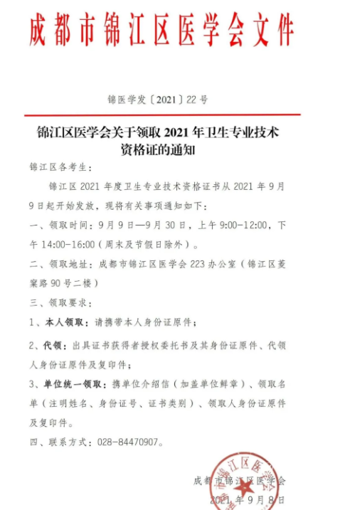 成都錦江區(qū)關于領取2021年衛(wèi)生專業(yè)技術資格證的通知