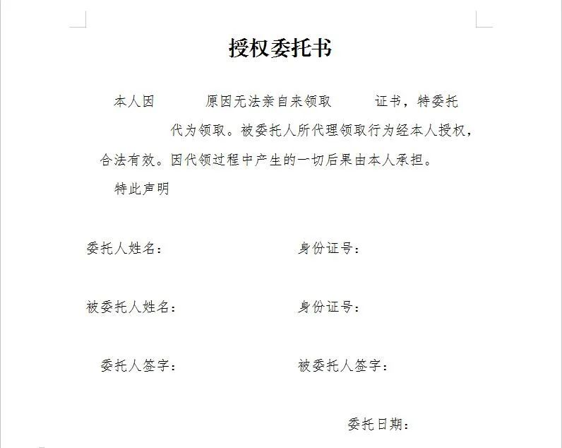2.他人代領(lǐng):考生出具委托書及身份證復(fù)印件交由被委托人,由被委托人帶身份證原件領(lǐng)取;或者代領(lǐng)人持雙方身份證原件領(lǐng)取。(委托書格式見(jiàn)下方)
