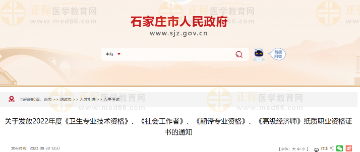 石家莊關(guān)于發(fā)放2022年衛(wèi)生專業(yè)技術(shù)資格紙質(zhì)資格證書的通知