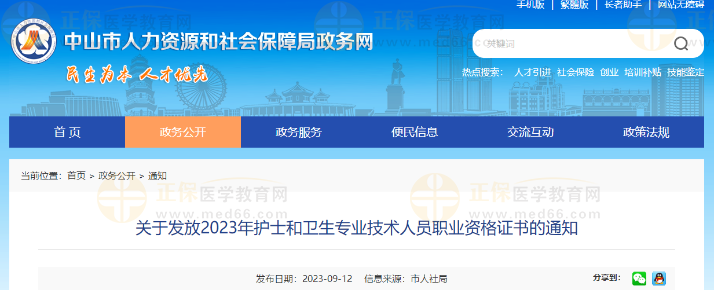 中山市人力資源和社會保障局政務(wù)網(wǎng)發(fā)布關(guān)于發(fā)放2023年護士和衛(wèi)生專業(yè)技術(shù)人員職業(yè)資格證書的通知,醫(yī)學(xué)教育網(wǎng)整理具體內(nèi)容如下: