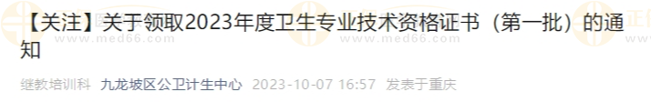 重慶九龍坡區(qū)關(guān)于領(lǐng)取2023年衛(wèi)生專業(yè)技術(shù)資格證書(第一批)的通知