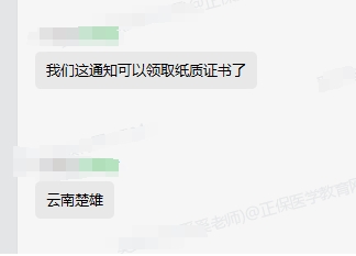 云南楚雄學(xué)員向網(wǎng)校反饋2024年衛(wèi)生資格紙質(zhì)證書(shū)可以領(lǐng)取啦!從反饋中可以看出云南楚雄衛(wèi)健局通知到醫(yī)院,醫(yī)院告知相關(guān)領(lǐng)證人員領(lǐng)取,如不在醫(yī)院上班,可自行咨詢?cè)颇铣坌l(wèi)健局領(lǐng)取紙質(zhì)證書(shū)相關(guān)事項(xiàng)。