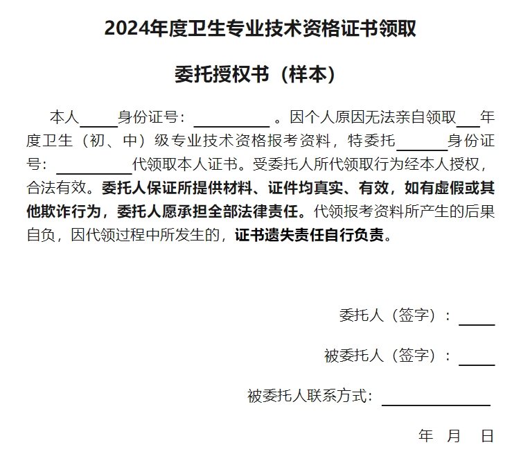 1.各考生請攜帶本人有效身份證原件領取相關證書。如因個人原因無法本人領取證書的,請由被委托人攜帶考生本人身份證復印件、考生本人填寫的《2024年度衛(wèi)生專業(yè)技術資格證書領取委托授權書》和被委托人的有效身份證原件及復印件領取證書。