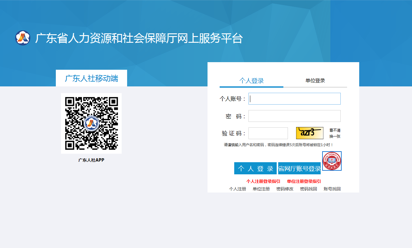 在系統(tǒng)入口點擊登錄按鈕進(jìn)入廣東省人力資源和社會保障廳網(wǎng)上服務(wù)平臺的個人登錄界面,輸入正確的賬號、密碼和驗證碼后即可登錄。