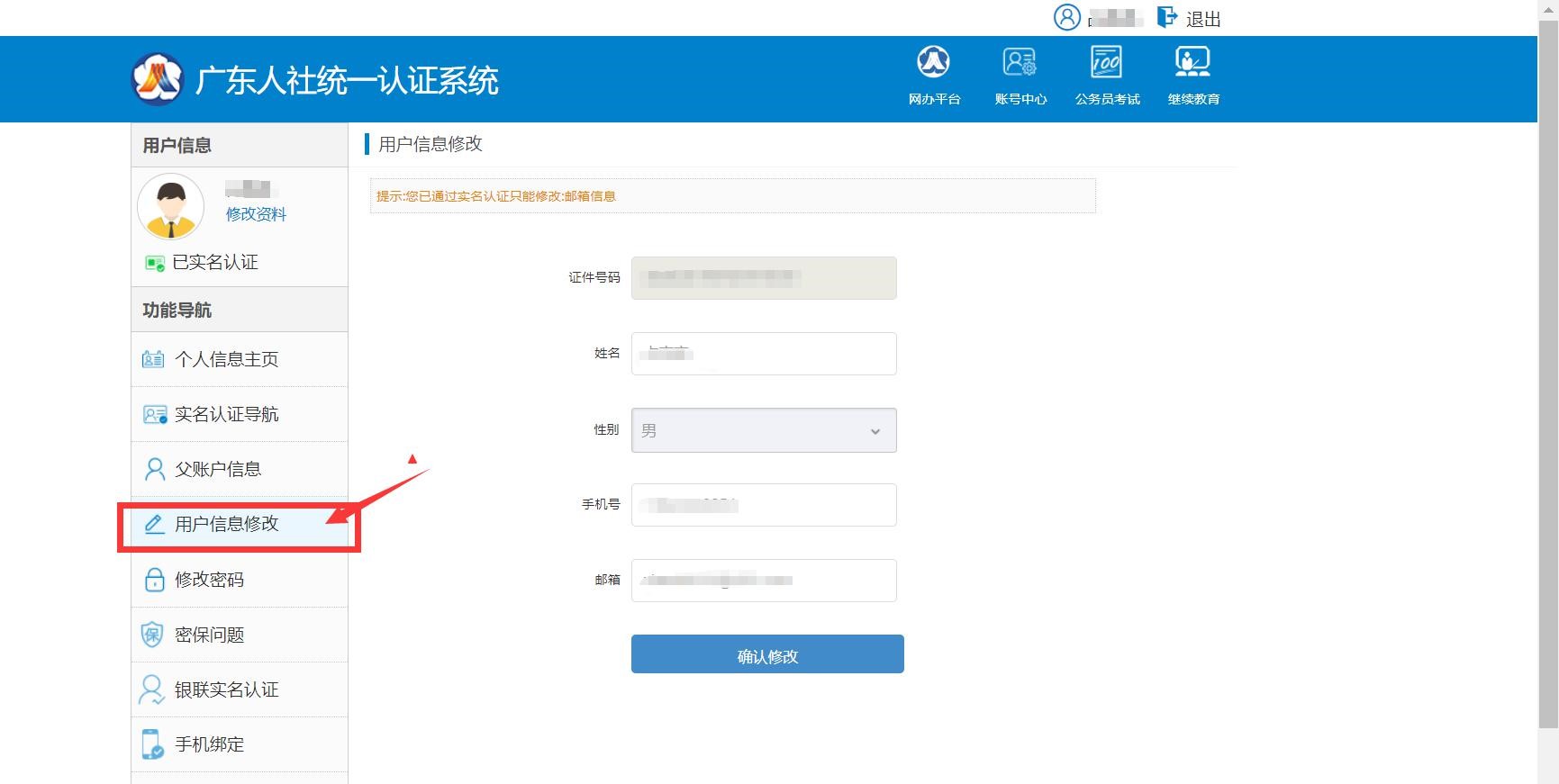 在賬號中心界面,點擊用戶信息修改按鈕可以對個人注冊信息進(jìn)行修改。注:個人證件號碼不可修改;姓名在個人實名認(rèn)證后不可修改。