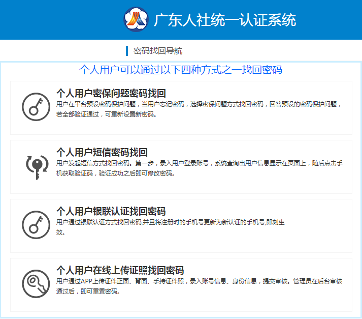 在廣東省人力資源和社會保障廳網(wǎng)上服務(wù)平臺登錄界面(網(wǎng)址:https://ggfw.gdhrss.gov.cn/ssologin/)點擊密碼找回按鈕,進(jìn)入個人密碼找回導(dǎo)航。