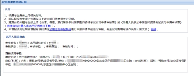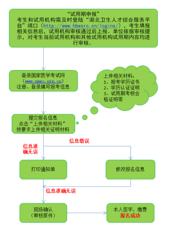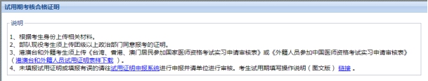我省啟用線上網(wǎng)絡(luò)方式進行試用期考核證明申報,考生需提供當(dāng)年試用期滿一年并考核合格的證明,試用機構(gòu)對考生提交信息進行審核及確認(rèn)。在國家醫(yī)師資格考試報名時,考生報名將于試用期系統(tǒng)信息校對核驗,凡平臺內(nèi)無信息的試用人員不得參加當(dāng)年醫(yī)師資格考試。報名前,務(wù)必先進行試用期申報,否則無法進入報名環(huán)節(jié)。試用期申報內(nèi)容及步驟詳見以下通知(http://www.hbwsrc.cn/news/show-1328.html)