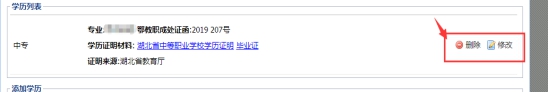 同一學(xué)歷層次的學(xué)歷,只能填寫一個;如需修改或刪除,請點擊原學(xué)歷后“修改”和“刪除”重新填寫。