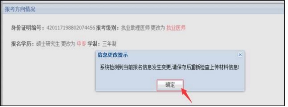 若省網(wǎng)提示證明材料上傳有誤,請根據(jù)相關(guān)提示對信息進行修改。點擊各模塊 “點擊修改”按鈕,按提示完成修改。若在國網(wǎng)中修改過報考方向,進入省網(wǎng)修改上傳材料時會出現(xiàn)信息更改的提示,點擊“確定”進行一步修改,修改完畢后再次提交并打印《通知單》。