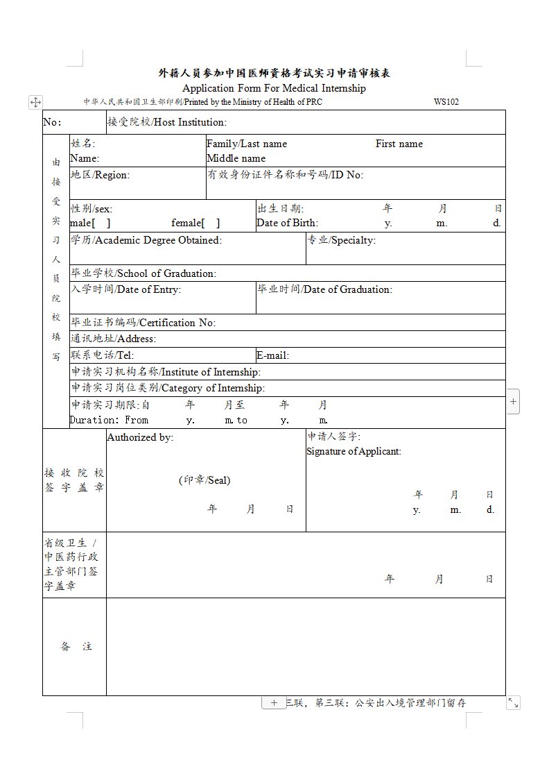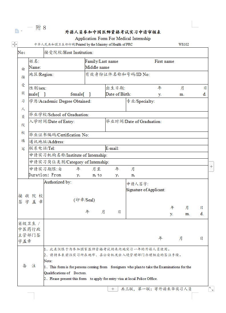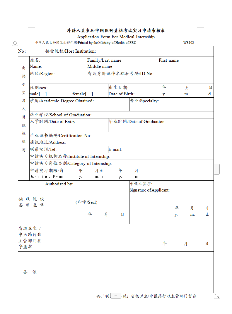 - · 報名審核材料下載:?《 外籍人員參加中國醫(yī)師資格考試實習申請審核表》