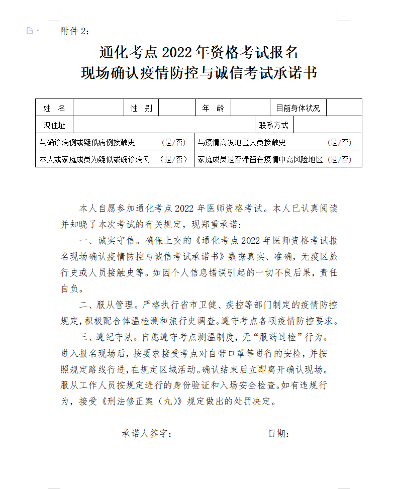 2022年鄉(xiāng)村全科助理醫(yī)師現(xiàn)場(chǎng)確認(rèn)疫情防控與誠(chéng)信考試承諾書(shū)下載(通化考點(diǎn))