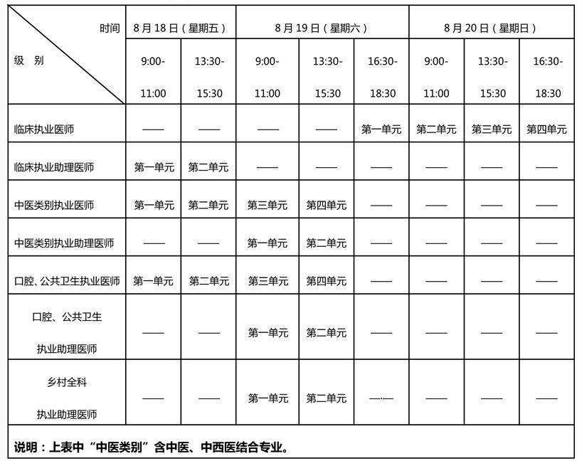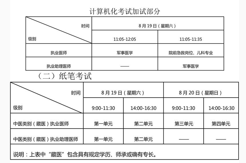 考試(藏醫(yī)除外)實(shí)行計(jì)算機(jī)化考試。中醫(yī)類別藏醫(yī)專業(yè)實(shí)行紙筆考試。軍隊(duì)現(xiàn)役人員加試軍事醫(yī)學(xué),院前急救崗位和幾科專業(yè)加試相應(yīng)內(nèi)容。除中醫(yī)類別(藏醫(yī))外,執(zhí)業(yè)醫(yī)師合格分?jǐn)?shù)線為 360分,執(zhí)業(yè)助理醫(yī)師合格分?jǐn)?shù)線為 180分??荚嚂r(shí)間如下: