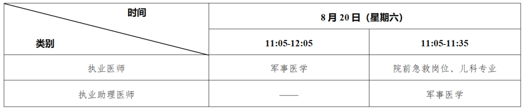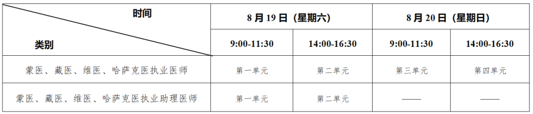 蒙醫(yī)、藏醫(yī)、維醫(yī)、哈薩克醫(yī)實(shí)行紙筆考試。其他類(lèi)別實(shí)行計(jì)算機(jī)化考試。軍隊(duì)現(xiàn)役人員加試軍事醫(yī)學(xué),院前急救崗位和兒科專(zhuān)業(yè)加試相應(yīng)內(nèi)容。除蒙醫(yī)、藏醫(yī)、維醫(yī)、傣醫(yī)、哈薩克醫(yī)、中醫(yī)(朝醫(yī))專(zhuān)業(yè)、中醫(yī)(壯醫(yī))專(zhuān)業(yè)外,執(zhí)業(yè)醫(yī)師合格分?jǐn)?shù)線為360分,執(zhí)業(yè)助理醫(yī)師合格分?jǐn)?shù)線為180分??荚嚂r(shí)間如下:
