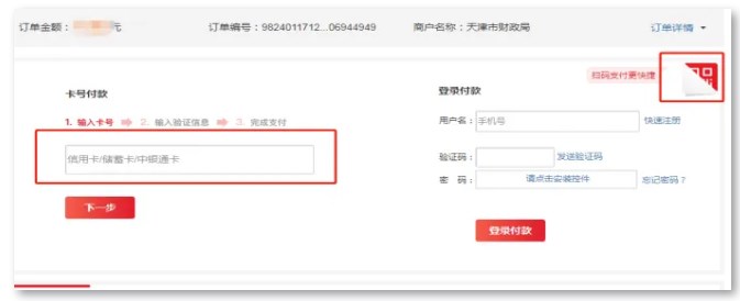 4.1跳轉(zhuǎn)到銀聯(lián)支付頁面后可以選擇左邊輸入銀行卡號支付,也可以點擊右上角后用銀行卡云閃付APP掃描支付。