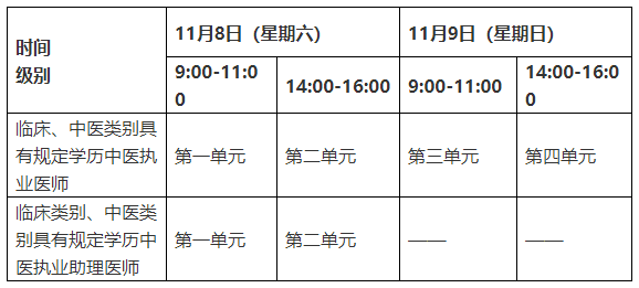 考試實行計算機化考試,軍隊現(xiàn)役人員加試軍事醫(yī)學,院前急救崗位和兒科專業(yè)加試相應內容。執(zhí)業(yè)醫(yī)師合格分數(shù)線為360分,執(zhí)業(yè)助理醫(yī)師合格分數(shù)線為180分。全國統(tǒng)一考試時間如下: