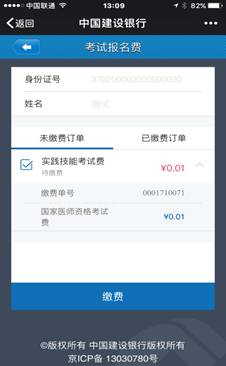 通過中國建設銀行“云平臺”繳納國家醫(yī)師資格考試費,可通過以下六種方式之一繳納(重點推薦使用:二維碼支付、微信建行支付和建行龍支付,特點:便捷、安全):1. 掃描二維碼直接繳費;2、建行微信支付,3. 建行龍支付,4. 建行手機銀行支付,5. 建行網站支付,6. 個人網上銀行支付,(注意!除建行龍支付外,僅能使用建行儲蓄卡繳費)。