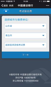 (1)找到繳費項目。登錄建行最新版手機銀行客戶端,選擇菜單欄“悅生活”→“行政教育”→“考試報名費” ,選擇“山東省青島市” →“國家醫(yī)師資格考試費”,點擊“下一步”