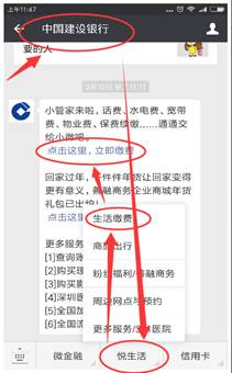 微信關注“中國建設銀行”公眾號,進入公眾號,點擊“悅生活”,再點擊“生活繳費”,在出現(xiàn)的頁面點擊“立即繳費”。根據(jù)提示完成繳費。