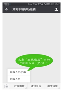 1.考生用手機微信打開“湖南非稅移動繳費”公眾號,點擊左下角“在線繳款”—“新版入口(2.0)”;